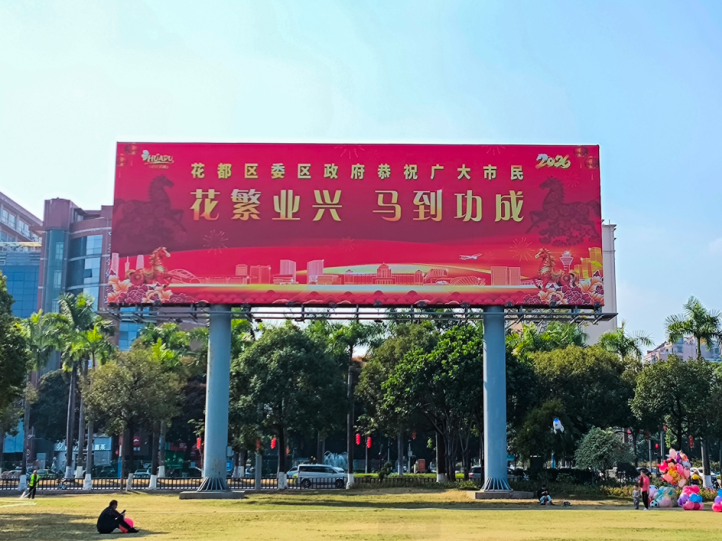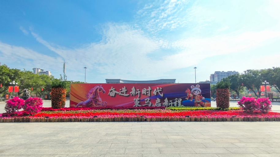花都多个城市地标换上新装。花都广场中央,“奋进新时代,策马启新程”新年主题宣传牌气势恢宏,与占地广阔的迎春花境、层层叠叠的红灯笼交相辉映,成为市民打卡拍照的热门点位。