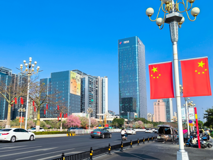 广州北站西广场,“花开世界,都等你来”巨幅主题宣传牌格外醒目,搭配节庆盆花,向过往旅客传递城市暖意。各主要路口“新春快乐”立体字花坛清新亮眼,白天花团锦簇,夜晚灯光璀璨,年味随处可感。